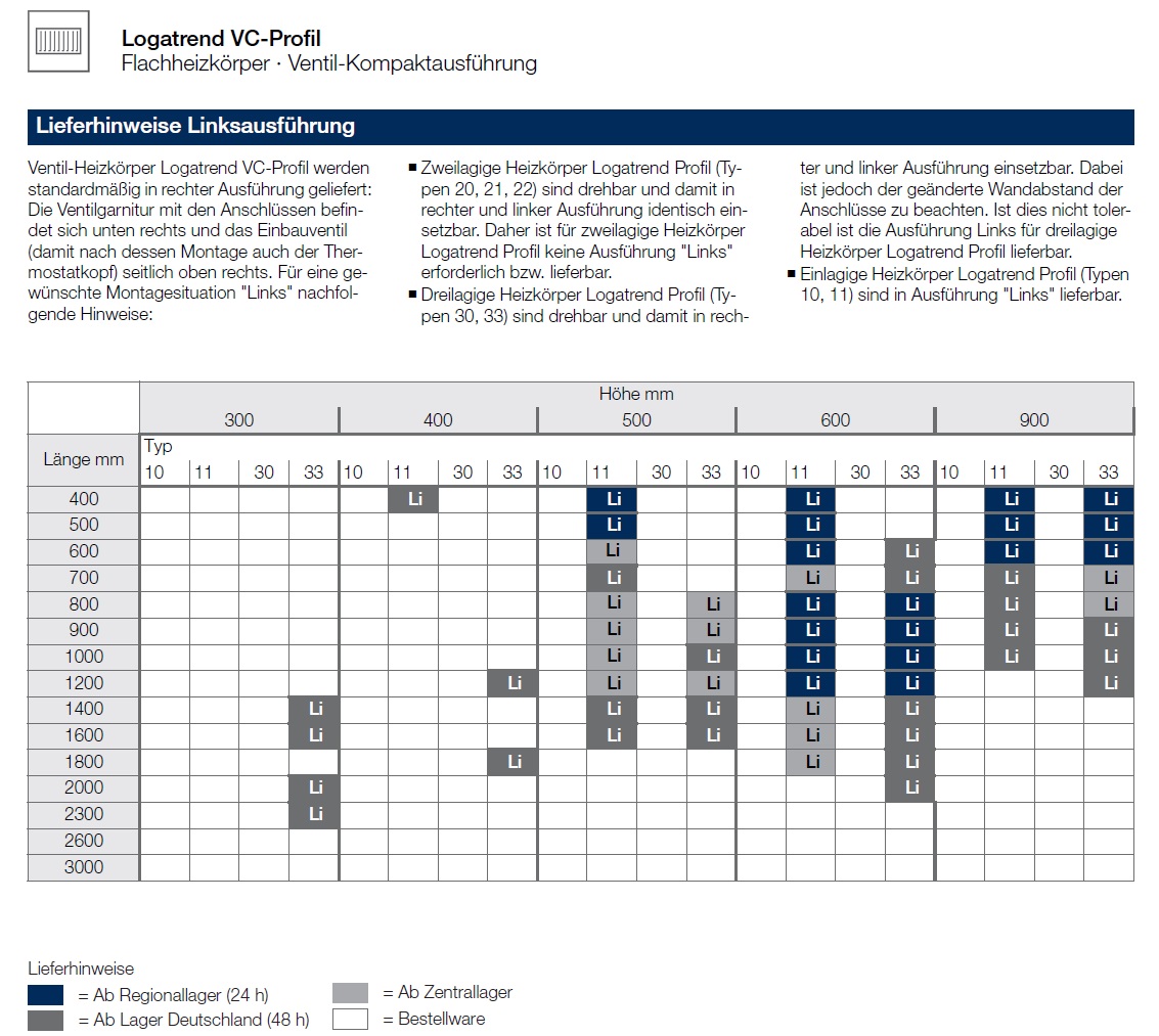 - alle Modelle und Ausführungen mit 10- 20 Werktagen Lieferzeit und Heizkörper in Sonderfarbe (Lieferzeit 3-7 Wochen) werden direkt auf Kundenwunsch beim Hersteller beauftragt